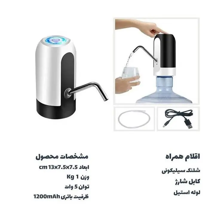 پمپ آب شارژی مدل Automatic Water Dispenser وسیله ای کاربردی در سفرهای کمپینگ و طبیعت گردی است. با خرید پمپ آبی می توانید آن را به گالن های بزرگ آب متصل کنید و به راحتی آب را پمپاژ کنید. این پمپ آبی در مقابل سرما و گرما مقاوم بوده و از مواد غیر سمی و بدون بو ساخته شده است. از این پمپ می توانید برای گالن های 1.5 تا 18.9 لیتری با دهانه 5.5 سانتی متری استفاده کنید.